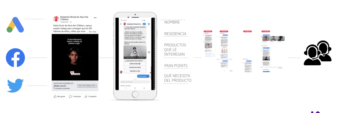 Podemos desarrollar estrategias conversacionales a través de Landing bots o Chatbots como el siguiente ejemplo: