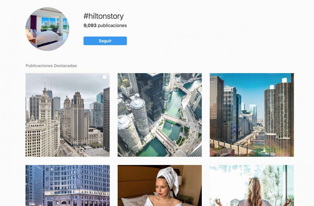 - La cadena Hilton adoptó el hashtag #HiltonStory para animar a los huéspedes a compartir sus historias de viajes. Hilton recurrió a Instagram para compartir las fotografías de sus visitantes, alcanzando así más de 100.000 seguidores.
