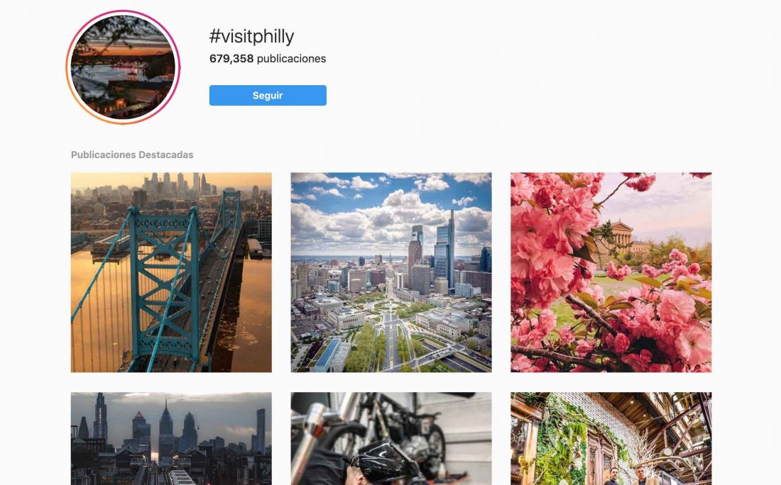 - Turismo de Philadelphia. Dentro de su portal de destino una página es posible ver en tiempo real imágenes subidas por los propios viajeros o los propios habitantes a través des hashtag #VisitPhilly, de esta manera la web aprovecha la conversación y el contenido que se comparte en Instagram.