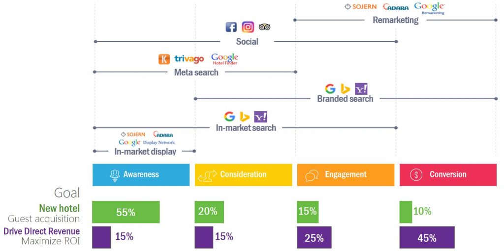 No se trata de asignar presupuesto a unos cuantos medios sino que haya un mix de medios coherente. Por ejemplo, si le importa más la planficación asigna más medios a la parte de SEO. Por otro lado, si desea generar reservas directas, concéntrese más de reserva. Por lo tanto, es muy importante alinear tus objetivos con la combinación de medios.