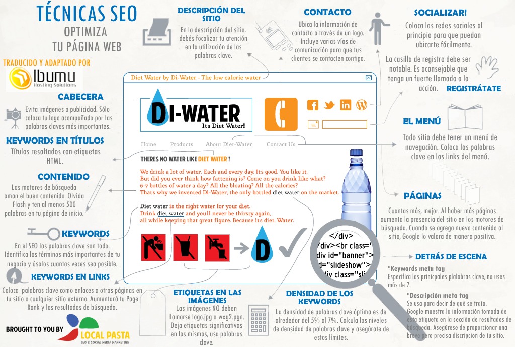 En mi día a día en los diferentes proyectos donde he participado debemos tratar y desarrollar estrategias de seo para optimizar nuestra página web. Nadie sabe a ciencia cierta cuales son las acciones que hay que realizar para que Google nos coloque en los primeras posiciones en cuanto a posicionamiento natural se refiere, pero mas o menos se intuye hacia donde van los tiros. En esta breve infografía encontrarás algunas de las Técnicas de seo para optimizar tu web, este es un buen inicio para adentrarte en este apasionante mundillo. Aquí os dejo la infografía y sobre todo, si este tema os interesa, implementarlo en vuestra web e investigar sobre el tema, nadie tiene la solución y tus resultados con sentido común mejorarán seguro.